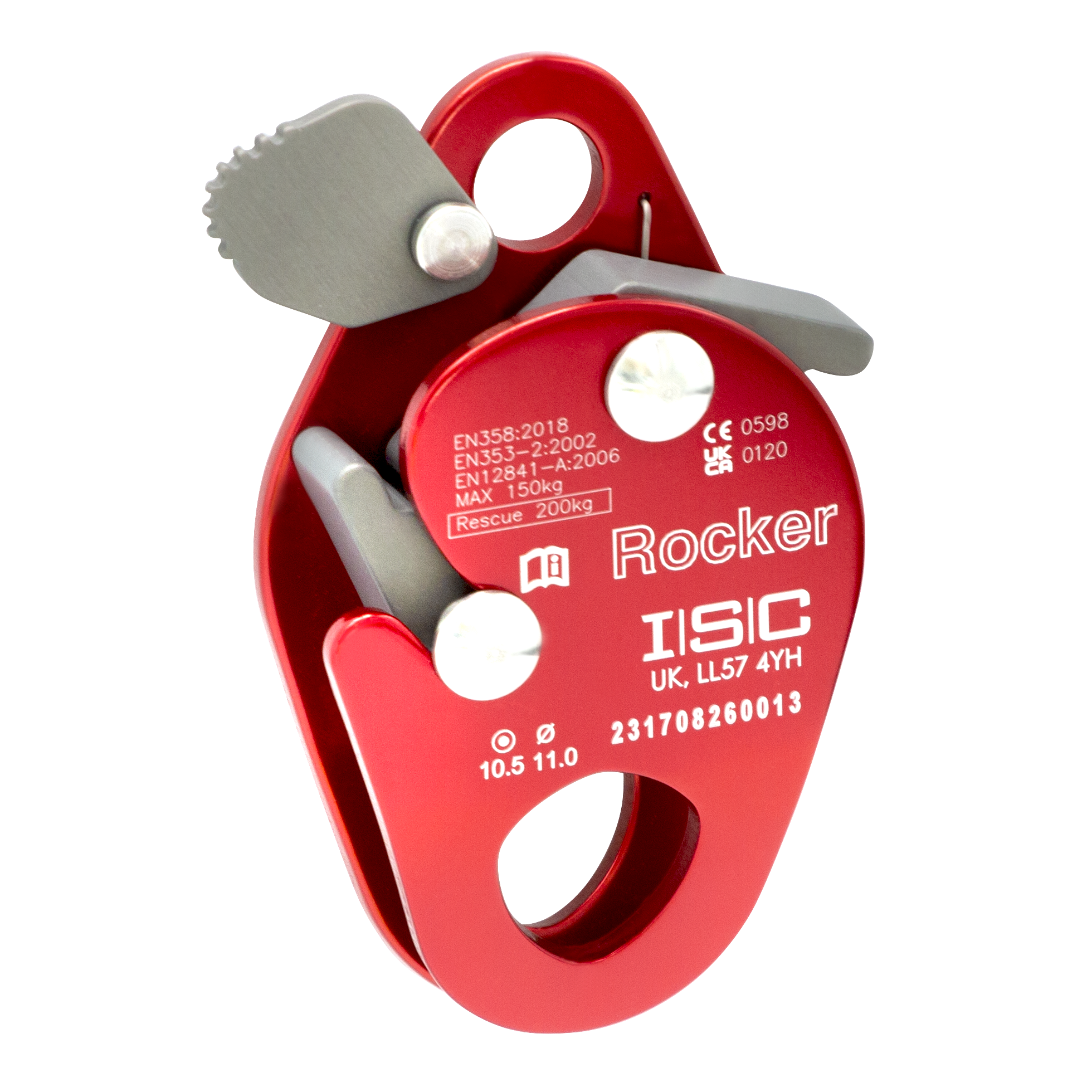 The Rocker RP500 is a versatile and convenient mid-line attachment fall arrest device that allows for hands-free use as a self-tailing device while traversing up or down the rope. It features a 'thumbcatch' that can be engaged to 'park' the device on the rope, allowing the user to easily adjust its position without fear of it sliding down uncontrollably. It is recommended for use without a textile shock absorber for optimal functionality.
